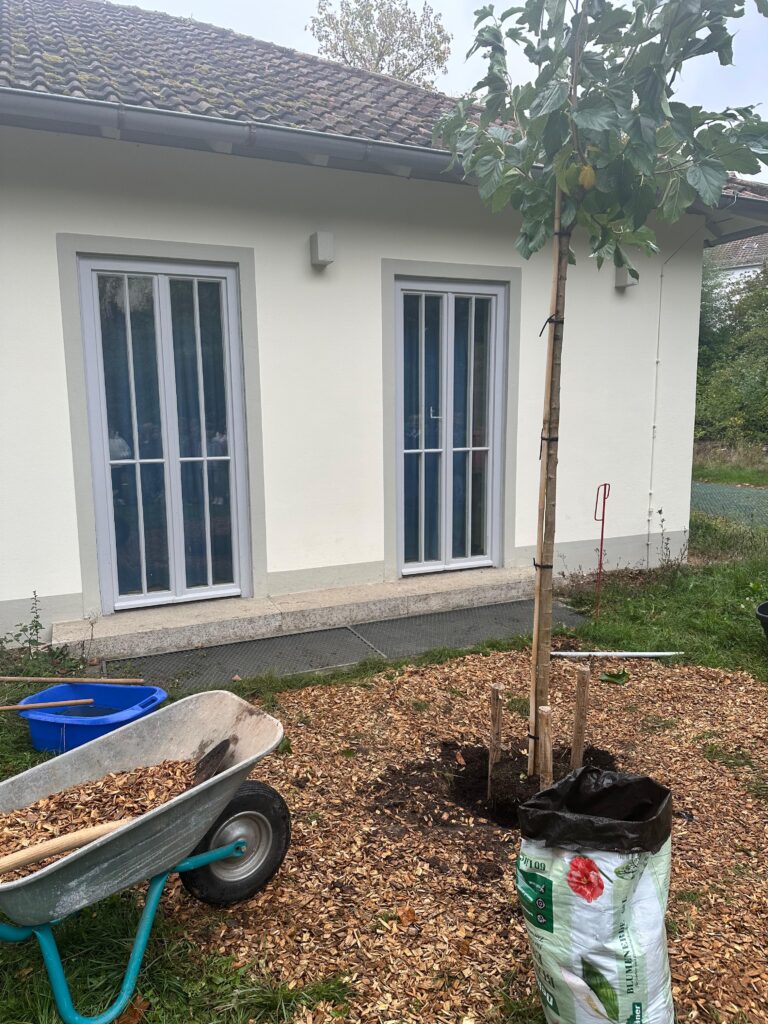 So hoffen wir, dass unser Baum gut anwachsen und noch vielen nachfolgenden Schulkindern Schatten spenden und Früchte bringen wird.